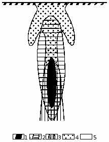ореол; 4 — надрудный ореол; 5 — современная денудационная поверхность.