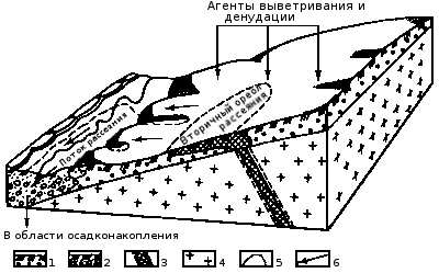 Схема формирования вторичных ореолов и потоков рассеяния (по А.П. Соловову): 1 —