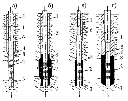 эксплуатационная колонна; 2 — фильтр; 3 — отстойник; 4 — разобщающая манжета с
