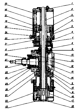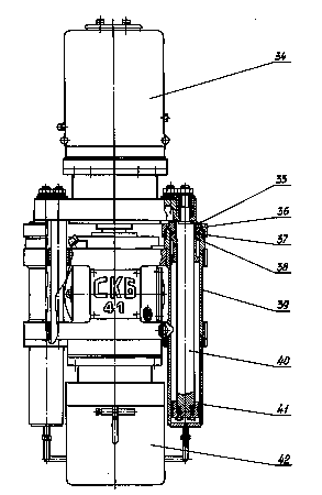 Рис. 6. Вращатель: 1 - полукольцо (4040.8681.023); 2 - шпиндель (4040.6441.014); 3 - обойма (4040.3392.012); 4 - кольцо 210-225-85-2-2 ГОСТ 18829-73; 5 - кольцо 245-260-85-2-2 ГОСТ 18829-73; 6 - манжета 1.2-100X125-1 ГОСТ 8752-79; 7 - кольцо 195-205-46-2-2 ГОСТ 18829-73; 8 - кольцо (4040.3191.614); 9 - манжета 1.2-120X150-1 ГОСТ 8752-79; 10-подшипник 46126 ГОСТ 831-75; 11 — шестерня (4040.7163.023); 12 — втулка (4040.3394.010); 13 — шпиндель нижнего патрона (4040.1468.006); 14 - шестерня (4040.7163.024); 15 - кольцо 100-110-58-2-2 ГОСТ 18829-73; 16 - подшипник 46134 ГОСТ 831-75; 17 - обойма нижняя в сборе (4030.3131.022); 18 - кольцо (4040.3141.001.680); 19 - гайка (4040.3154.010); 20 - пружина (4050.9113.138); 21 - подшипник 46320 ГОСТ 831-75; 22 - кольцо 205-215-58-2-2 ГОСТ 18829-73; 23 - подшипник 32216 ГОСТ 8328-75; 24 - манжета 1.2-105X130-1 ГОСТ 8752-79; 25 - подшипник 216 ГОСТ 8338-75; 26 - кольцо (4040.3141.910); 27 - вал (4040.1334.003); 28 - шестерня (4040.6811.010); 29 - кольцо 220-230-58-2-2 ГОСТ 18829-73; 30-стакан (4040.3166.005); 31 - кулачок (4050.6871.002); 32 - стержень (4040.1413.032); 33 - пружина (4050.9113.137); 34-кожух верхний (4030.4132.063); 35 — кольцо (4040.4181.012); 36 - кольцо (4040.3141.386); 37 - кольцо 080-090-58-2-2 ГОСТ 18829-73; 38 - кольцо 050-060-58-2-2 ГОСТ 18829-73; 39 - цилиндр со штуцером (4030.3141.006); 40 - шток с поршнем (4030.7511.011); 41 — кольцо поршневое (4040.8621.003); 42 - кожух нижний (4030.4132.292).